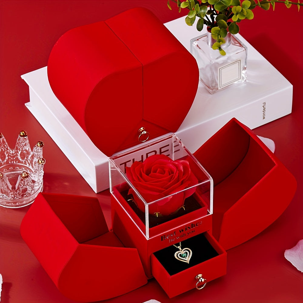 Red Rose & Green Necklace Gift Box - Romantic Valentine’s Day Jewelry Gift for Her